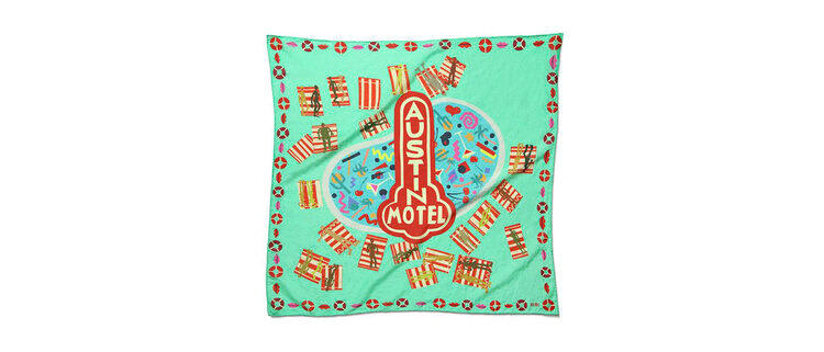 This funky bandana (perfect for ACL… wink wink!) is a custom collaboration between Austin Motel and Austin-based artist, Paige Russell of ELOI.