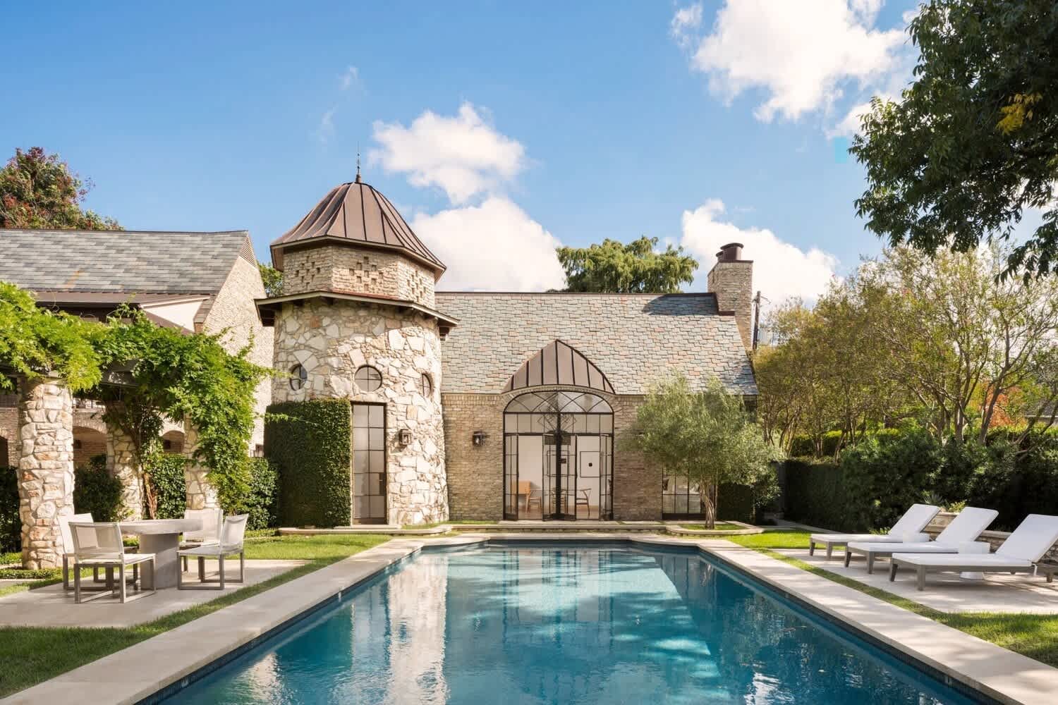 Easily one of the finest urban residences in the state, the Norman Tudor-style compound was originally built for Eugene and Frances Tips in 1930-1932. The stunning pool house is accented with soaring ceilings and gorgeous antique steel and glass windows, creating a seamless flow to the pool and welcoming grounds beyond.
