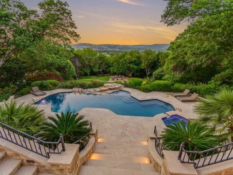 The poolside views from this beautiful estate showcase Lake Austin, Pennybacker Bridge, and the Austin Country Club. This stunning 1.78-acre property also boasts park-like privacy lushly landscaped with mature oak trees and a waterfall cascading into the limestone-edged pool.