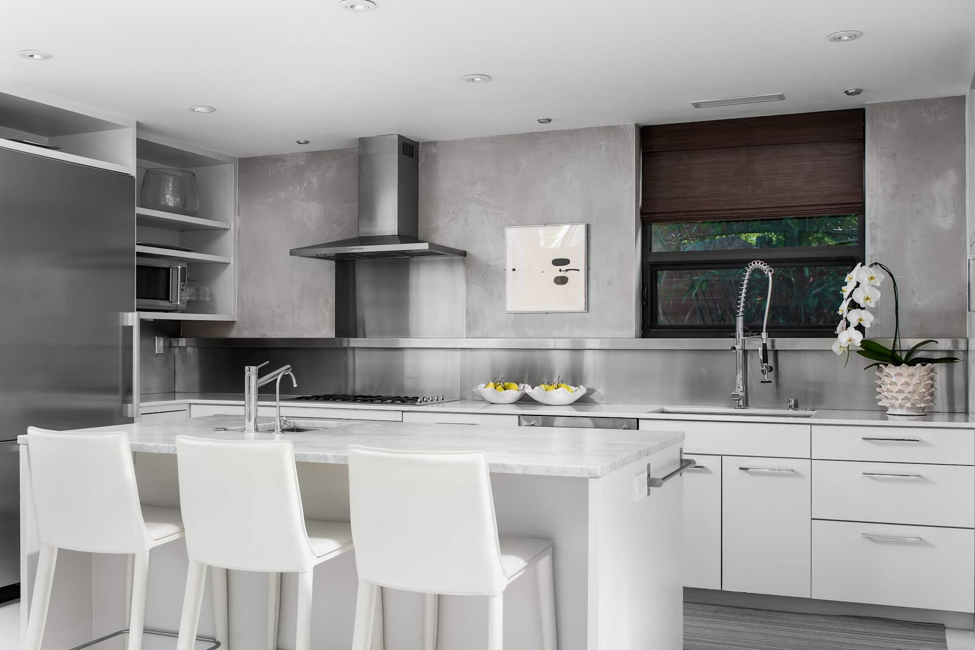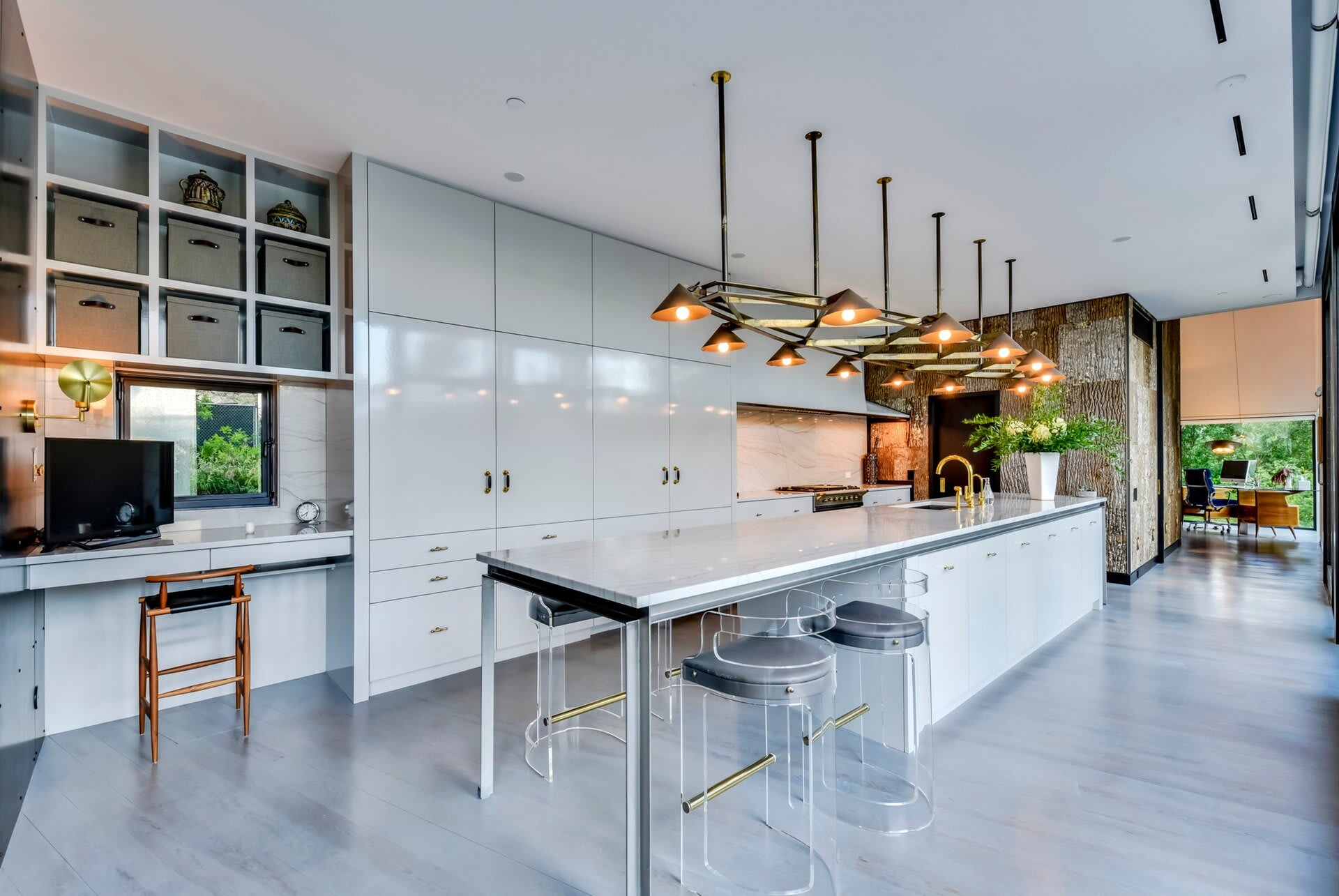 Designed by Kevin Stewart of Design Hound and built by Alan Muskin, this stunning Westwood home is just minutes from Westlake conveniences in case of any last-minute Thanksgiving dinner needs. A waterfall counter is the focal point of the kitchen, which opens onto a spacious outdoor deck and pool for entertaining guests of every age.