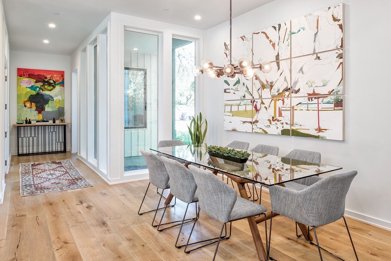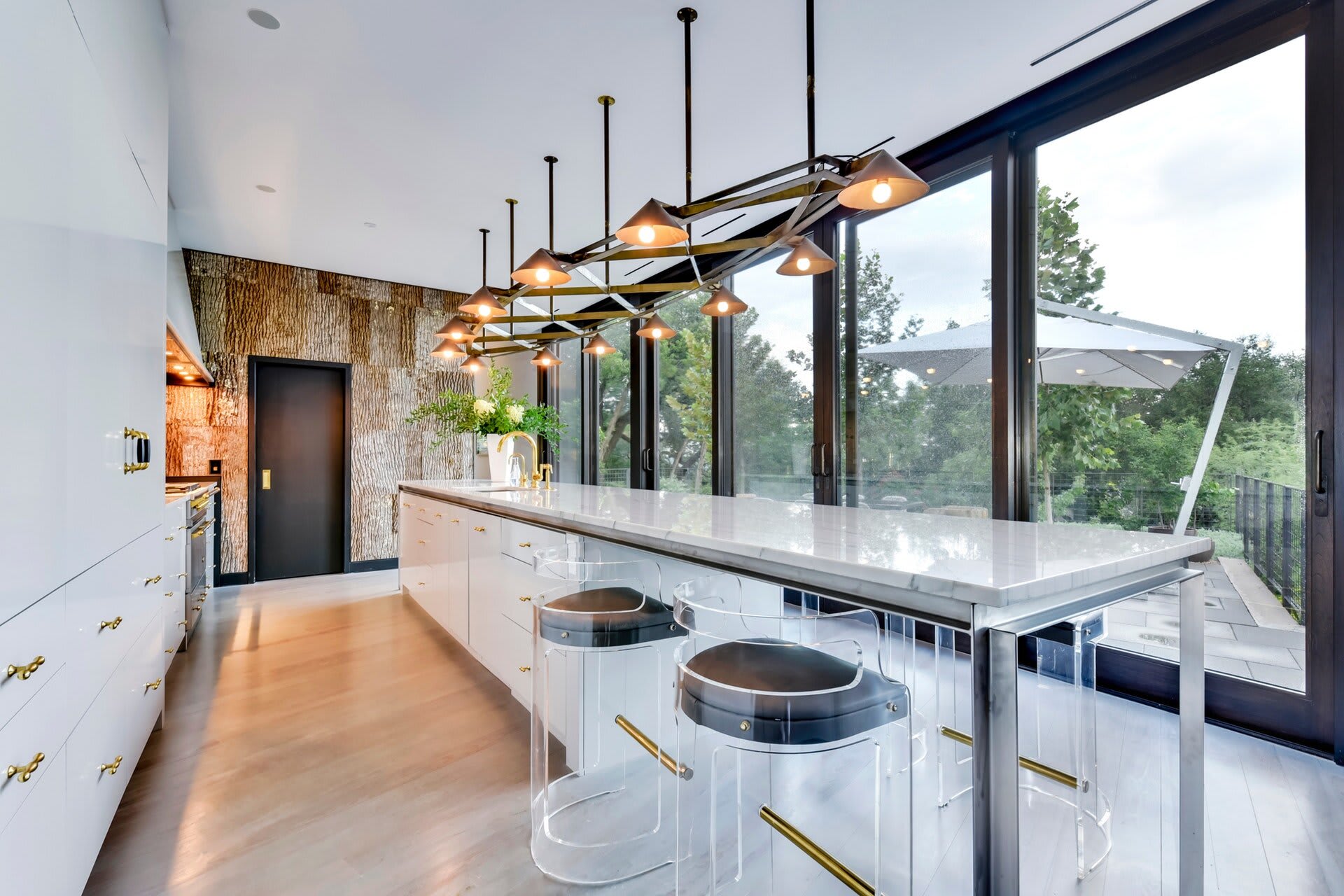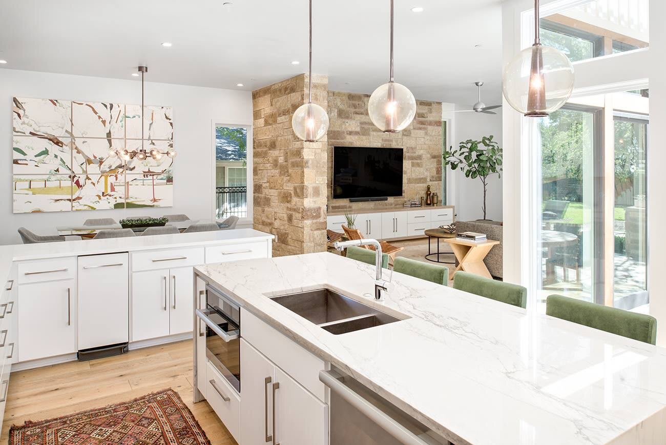 Enjoy Thanksgiving in 78704 at this contemporary residence. Heritage grove oak trees surround the thoughtful build, which warmly welcomes visitors with its plentiful natural light and open-concept spaces. Preparing a large meal would be more than enjoyable at 411 W Annie -- The gourmet kitchen features a gas stove, Miele built-in refrigerator and Carrera marble countertops.