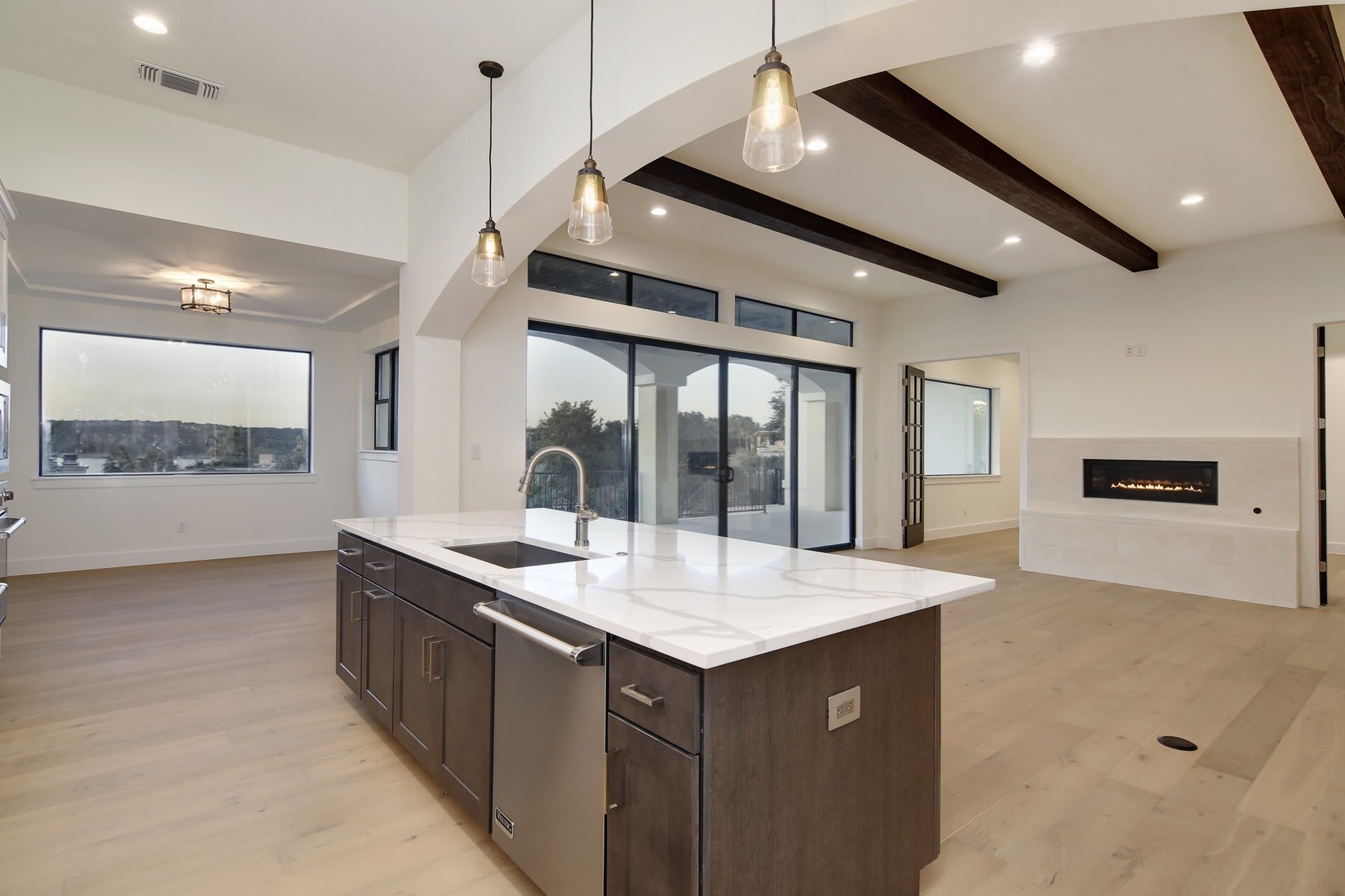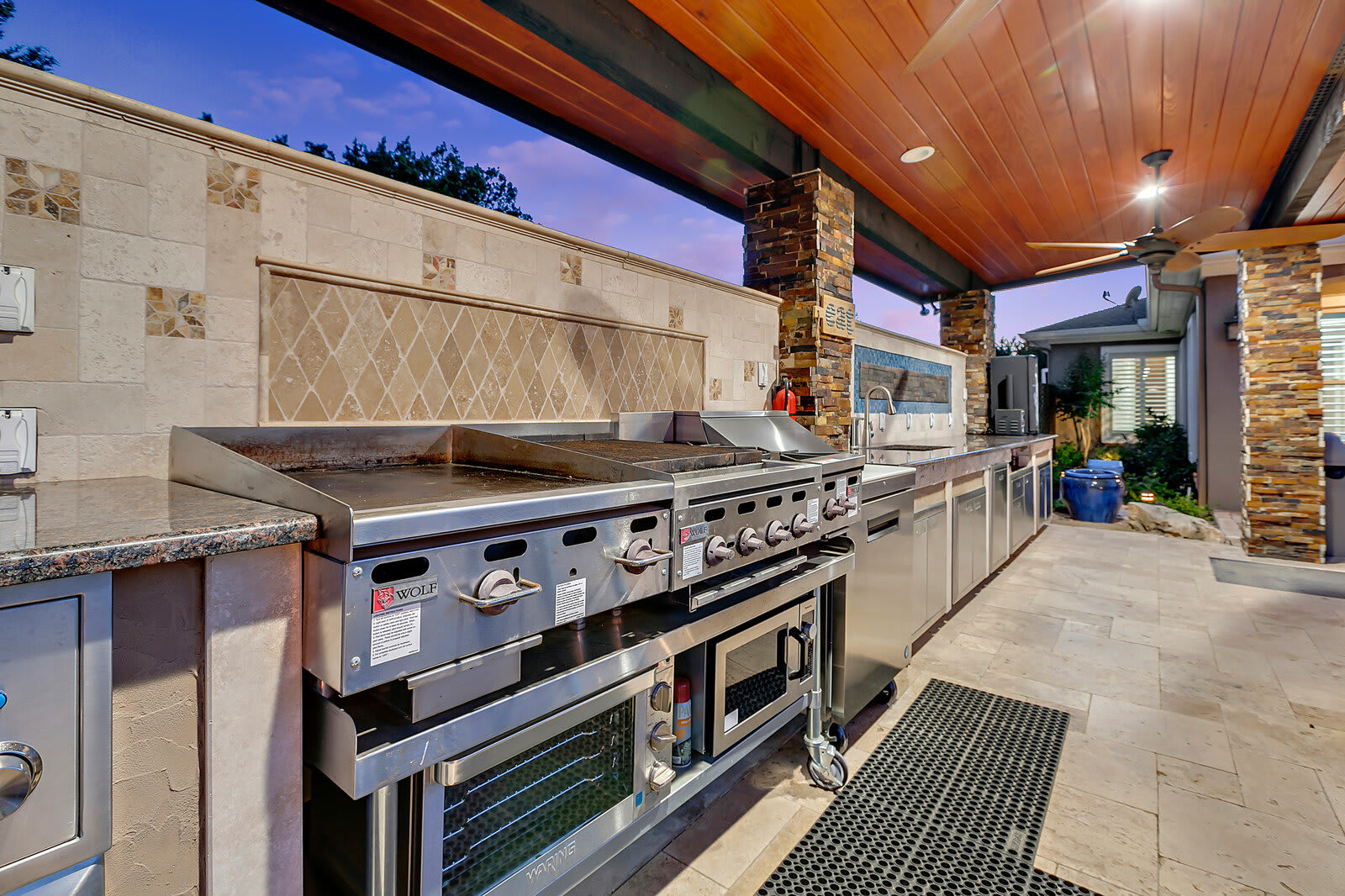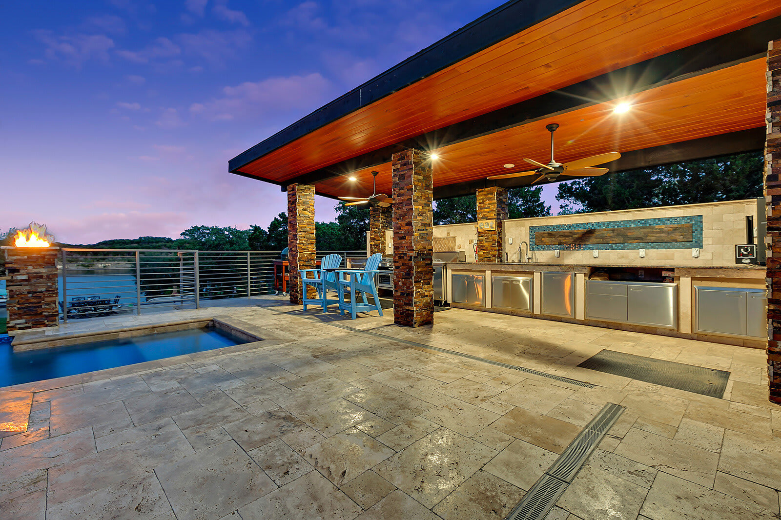 Enjoy Thanksgiving dinner on the lake at 3301 Brasada Lane. Well-thought details can be found throughout this extraordinary one-story home, including an outdoor kitchen boasting high-end finishes and top-notch appliances including dual Wolf stovetops, a microwave oven, and grill. There’s no better way to prepare dinner than cooking next to the lake!