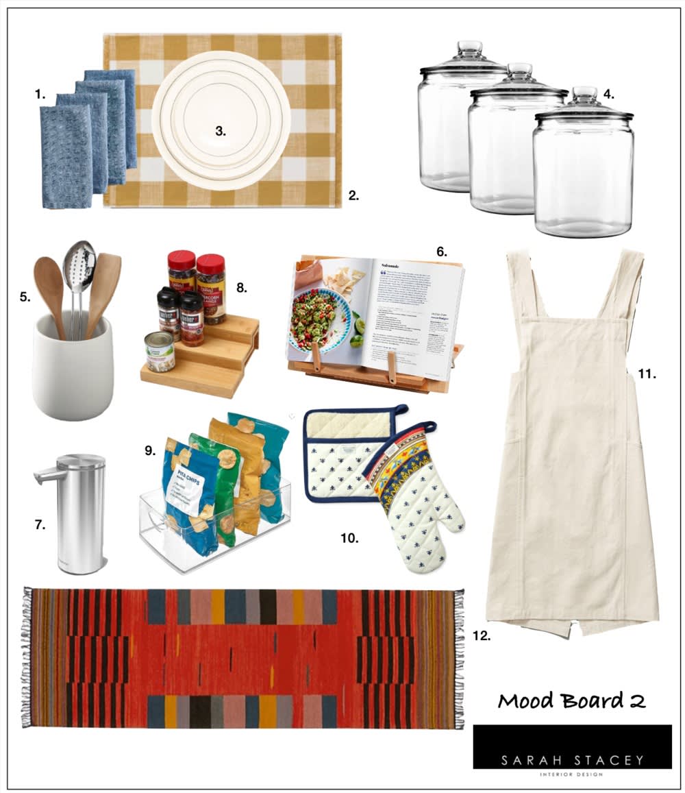 Mood Board 2 – 1. Napkin 2. Placemat. 3. Plates 4. Canisters 5. Utensil Holder 6. Cookbook Holder 7. Soap Dispenser 8. Spice Rack 9. Oven Mit 10. Clear Bin 11. Apron 12. Rug