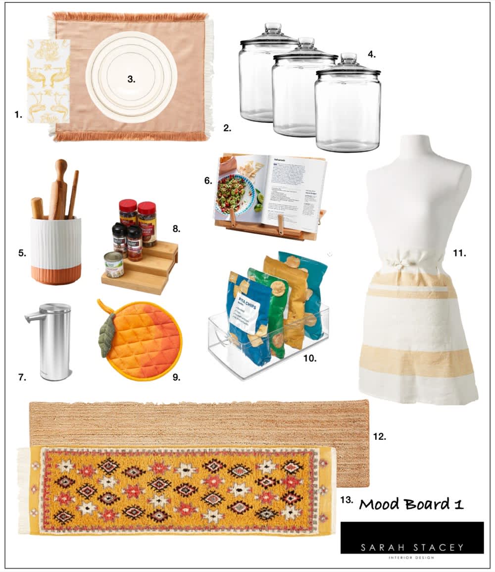Mood Board 1 – 1. Napkin 2. Placemat. 3. Plates 4. Canisters 5. Utensil Holder 6. Cookbook Holder 7. Soap Dispenser 8. Spice Rack 9. Oven Mit 10. Clear Bin 11. Apron 12. Natural Rug 13. Colorful Rug