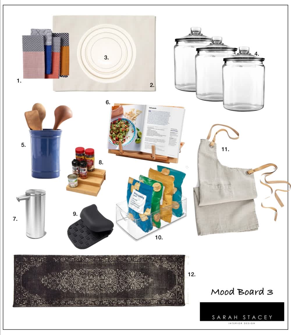 Mood Board 3 – 1. Napkin 2. Placemat. 3. Plates 4. Canisters 5. Utensil Holder 6. Cookbook Holder 7. Soap Dispenser 8. Spice Rack 9. Oven Mit 10. Clear Bin 11. Apron 12. Rug