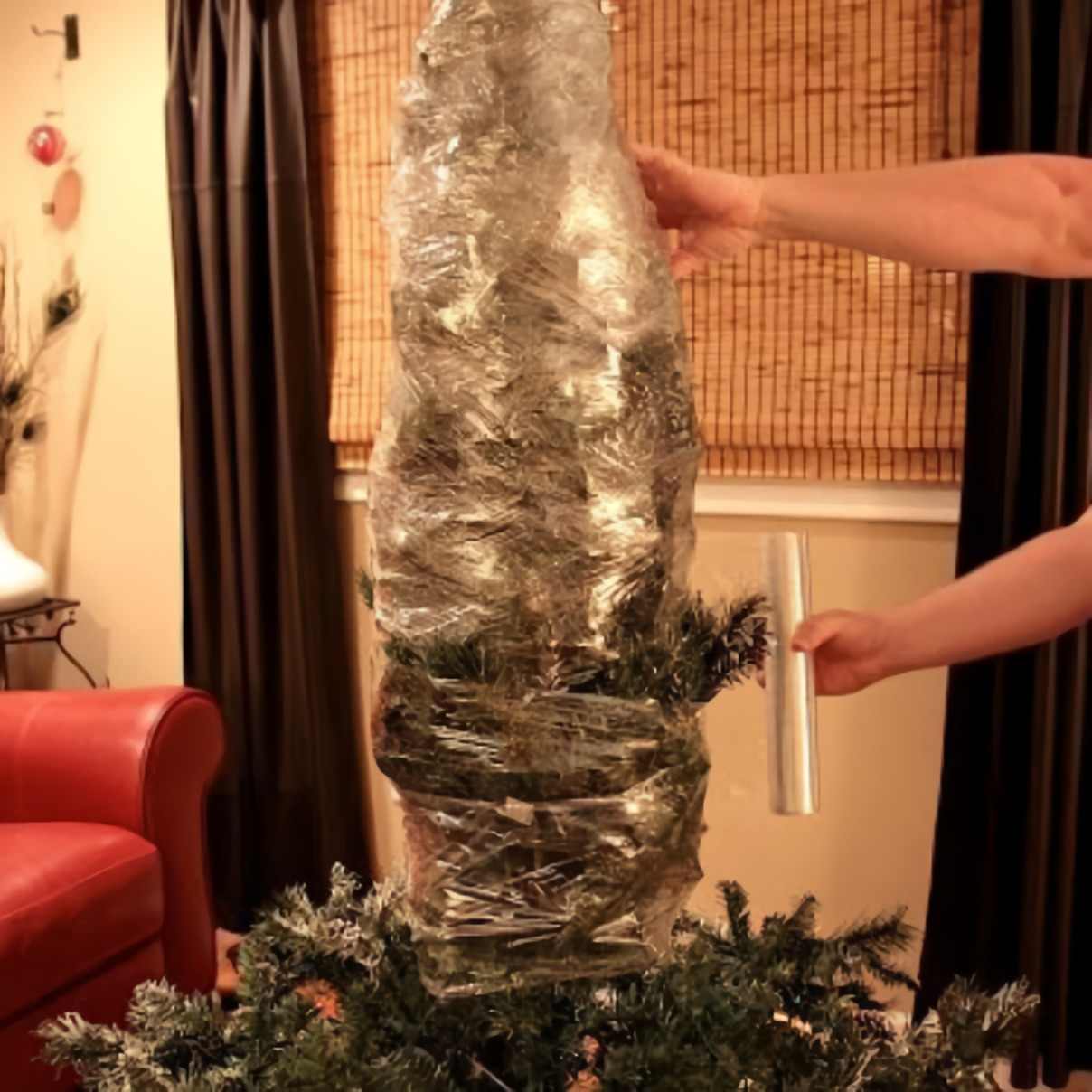 Cover your tree in seran wrap. If you store your tree in a garage or storage unit, you’ll want it to be compact and kept clean year long. Wrapping it loosely in cling wrap does just the trick!