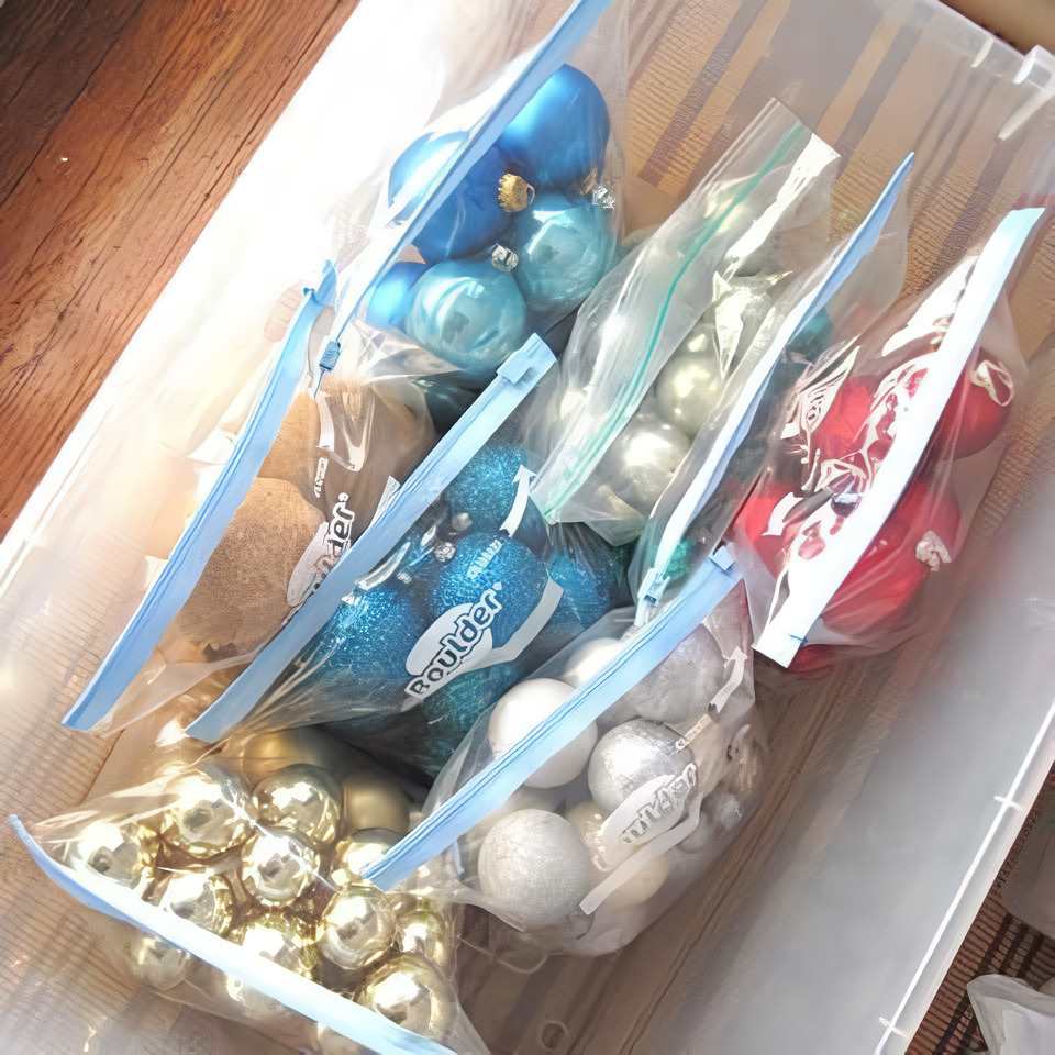 Use clear Ziplock bags for non-breakable ornaments. Group ornaments by color and place them in clear baggies for easy organization within a larger Rubbermaid.